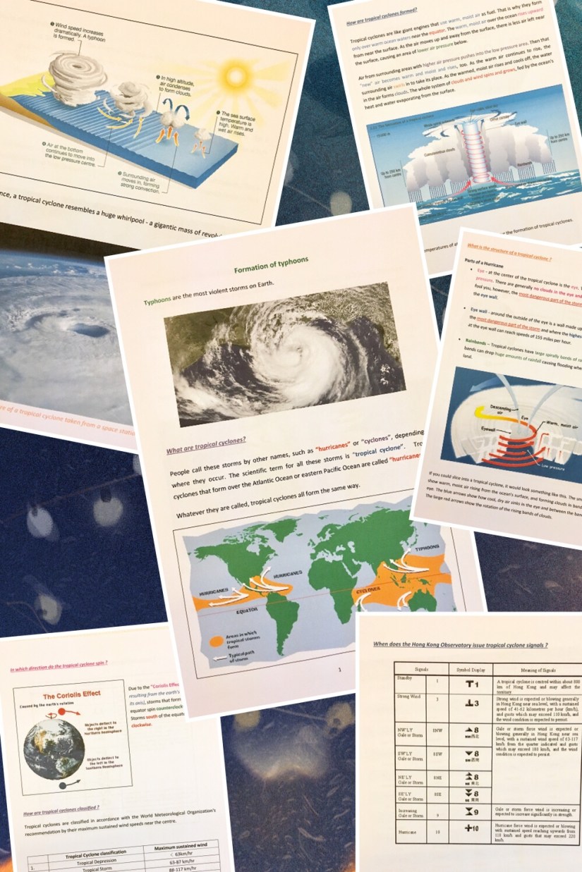 去年十月,十號風球,香港史上最強颱風「山竹」到訪當天,我跟孩子談颱風。這是一份集合了美國太空總署、香港天文台及一些網上地理材料的自製教材,包括颱風的形成、結構、等級、熱帶氣旋警告訊號等。
