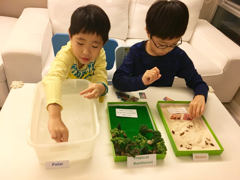 為了讓孩子學習得更投入,這次除準備了英文教材外,還特別做了三個模型,特顯三個生態環境的特色,讓孩子感受一下天氣的冷暖。沙漠用了幼黃沙及乾樹葉、熱帶雨林用了草皮紙及樹模型、極地用了冰。