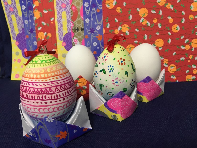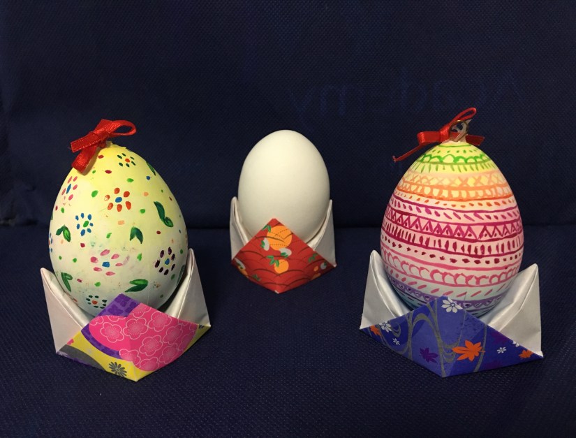 先到文具店買一隻復活蛋和手工紙 (如果想小蛋盒有點和風味,可選購和風手工紙),然後把復活蛋塗上美麗的圖案,再跟著影片用手工紙摺成小蛋盒,這個小手工就完成啦 !!