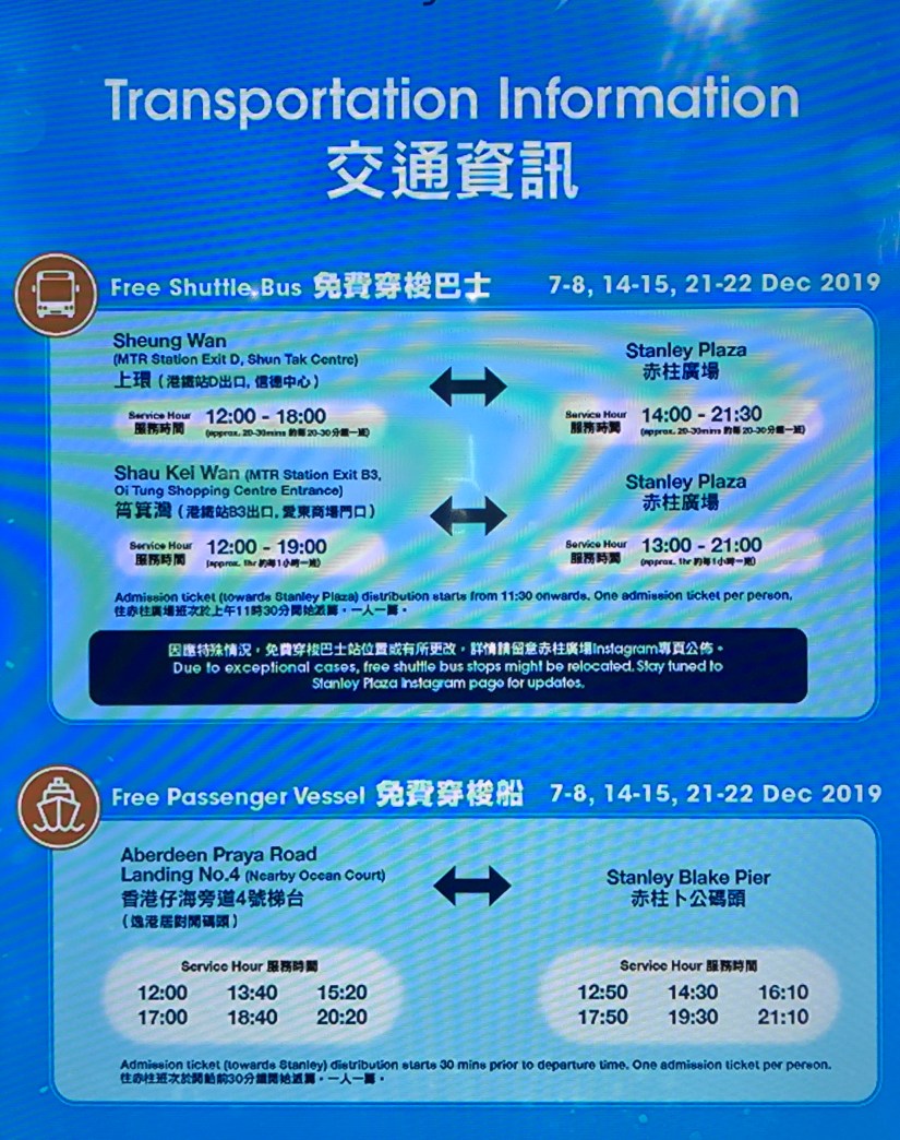 大會很貼心,知道前往赤柱廣場的交通不太方便,於是安排了穿梭巴士往來上環(每30分鐘一班)及筲箕灣(每一小時一班)(詳情請參閱附圖時間表)。