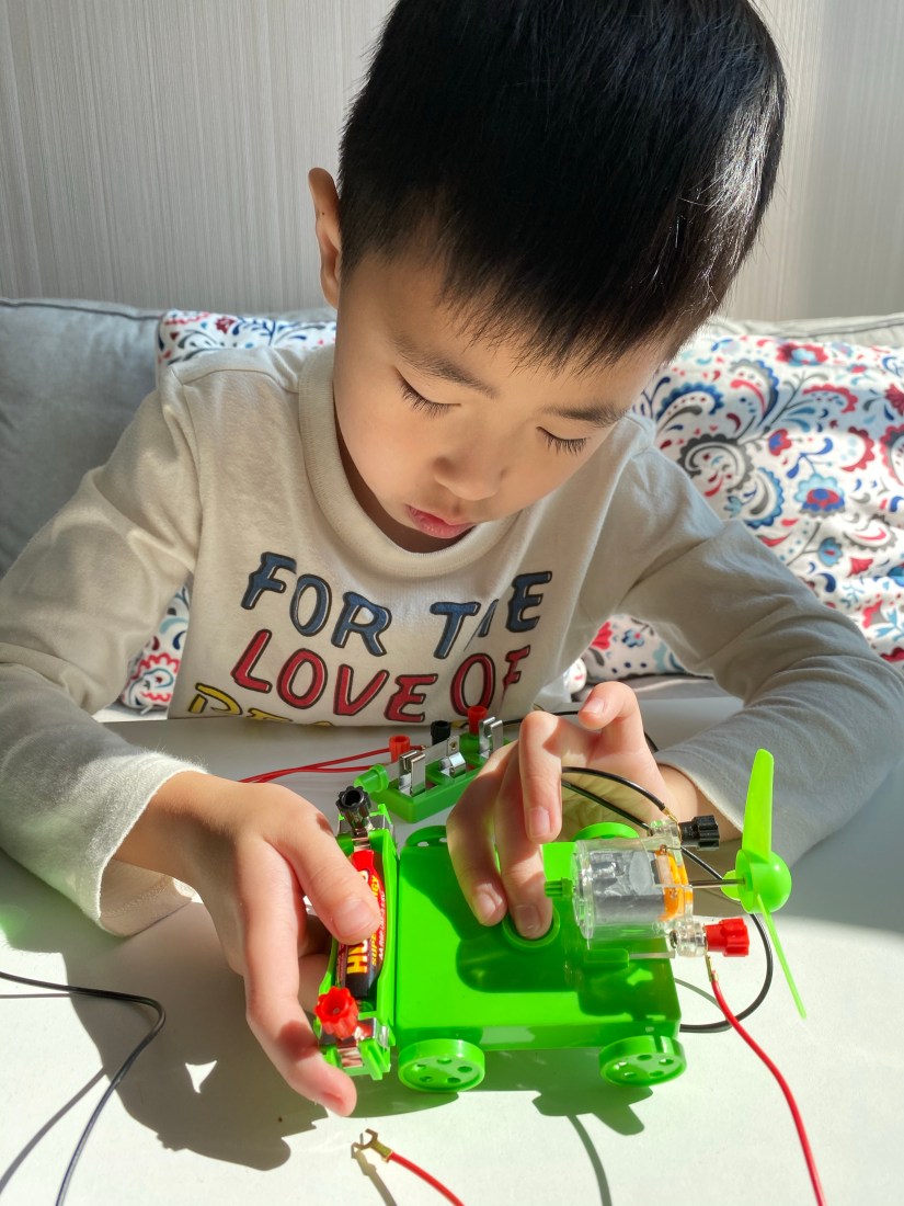 弟弟透過簡單的電路遊戲,了解電的特質,包括正/負極,連結/中斷電路對電流的影響。「電能」還能轉化成「動能」,啟動風扇,也能轉化為「光能」和「熱能」,燃亮燈泡。