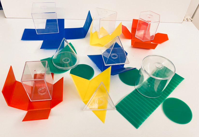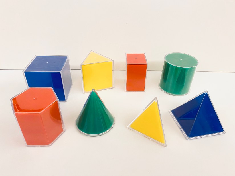 今天,我們在遊戲中學習。這套立體圖形很好,可以把多個立體面打開,讓小朋友清楚看見,每個立體圖形有多少個面、多少隻角、多少條邊。