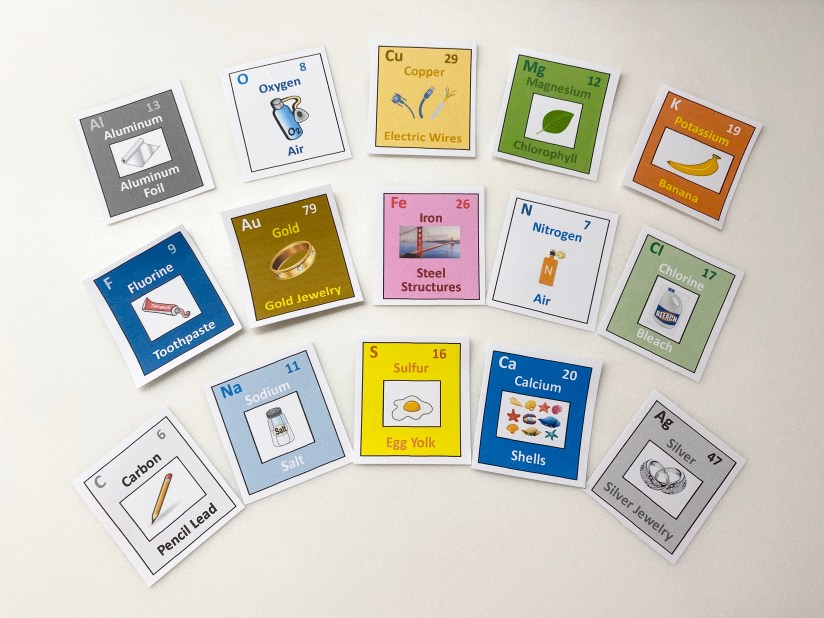 我選取了15 個最常用的元素,設計了一套遊戲咭。每個元素有兩張遊戲咭,一張只有元素名稱,另一張則加上圖片。我先把有圖片的遊戲咭貼在「寶物」上,由孩子拿著只有元素名稱的遊戲咭把「寶物」找出來。花了十五分鐘,所有「寶物」都找到了!