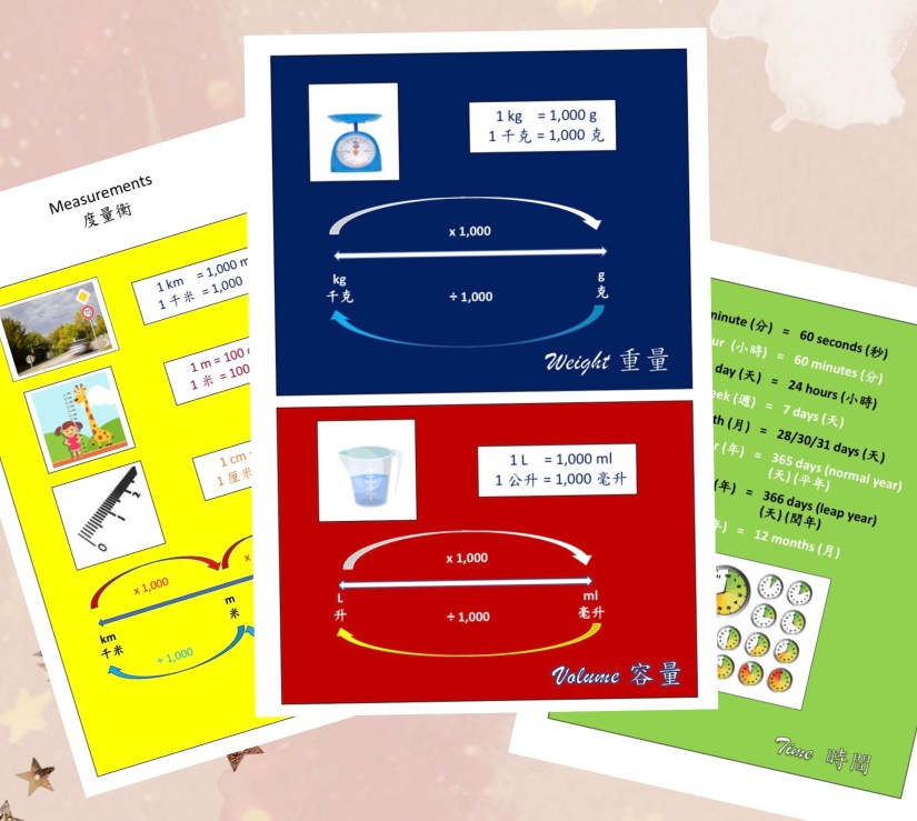 今天,我和孩子來個溫故知新,把初小需要認識的量度單位,用圖像及列表方式來個總結,也跟大家分享一下。這份教材包括: