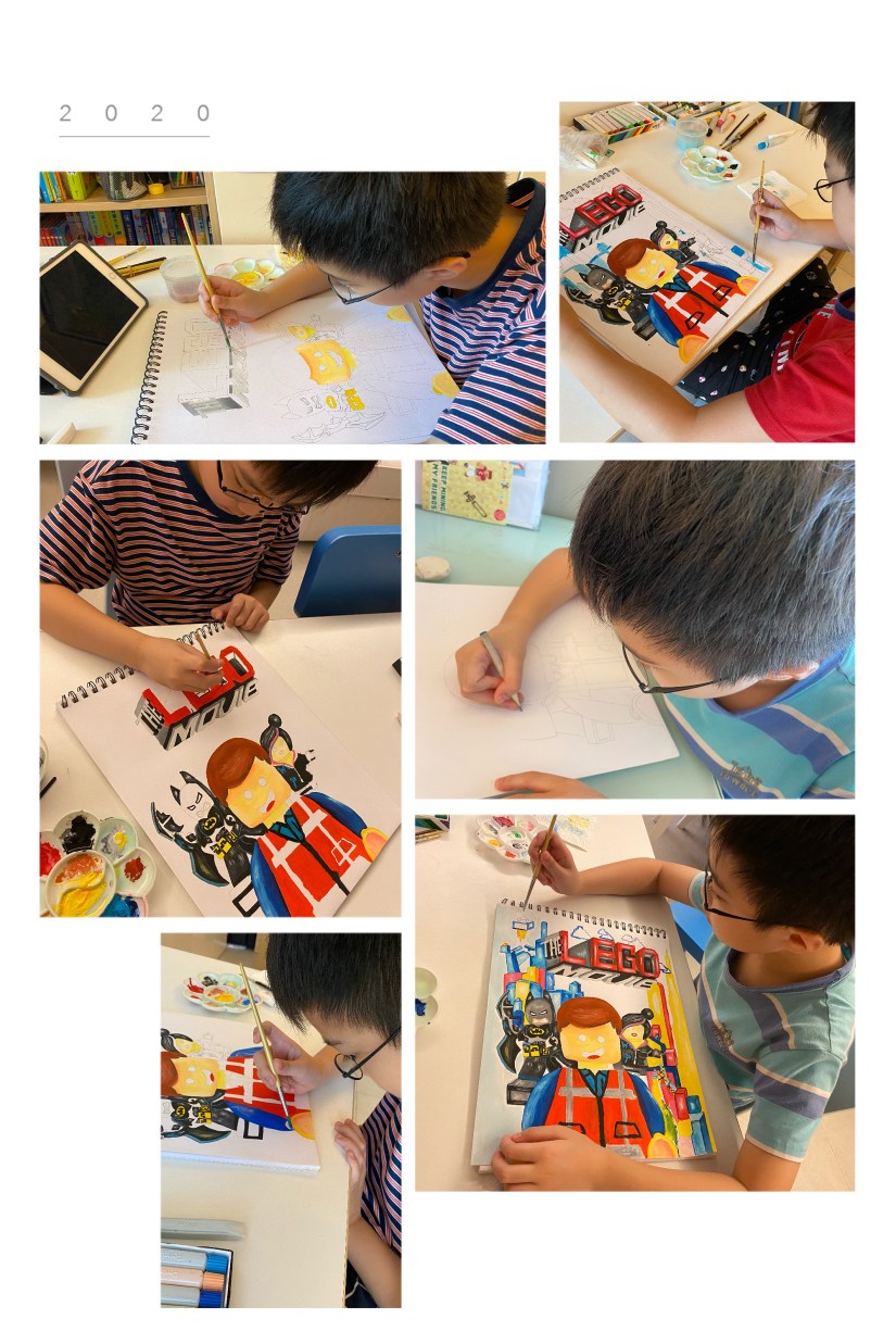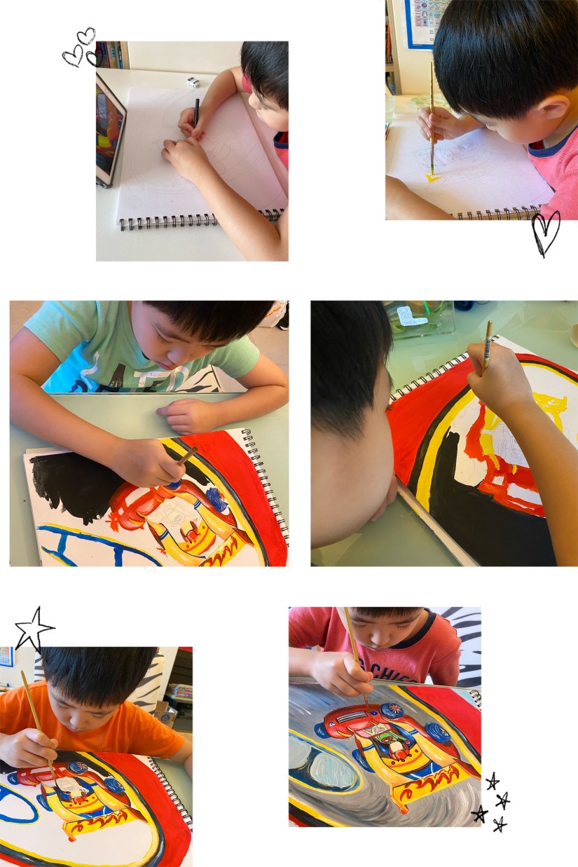 我從不相信傳統小學的美術課能啟發創意,或認真地教授技巧。畢竟上課時間短,人數多,學生能力參差,老師能力也參差。我是親眼見過小兒小一美術班的「作品」是如何的不濟 (基本上每位同學的「作品」均一模一樣,明顯地,大家上課就是被指示拼命地抄!)所以,美術我也是 homeschooling,盡量不假手於人。