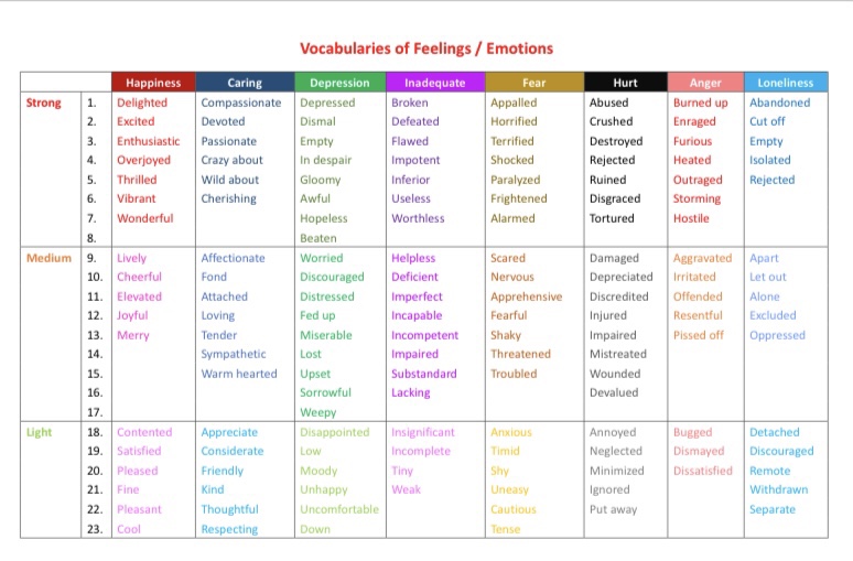 今天,我們整合了一個感情詞彙表,包含了八種情感,每種情感再細分為由強至弱三個級別,每級別列出了4-8個詞彙。
