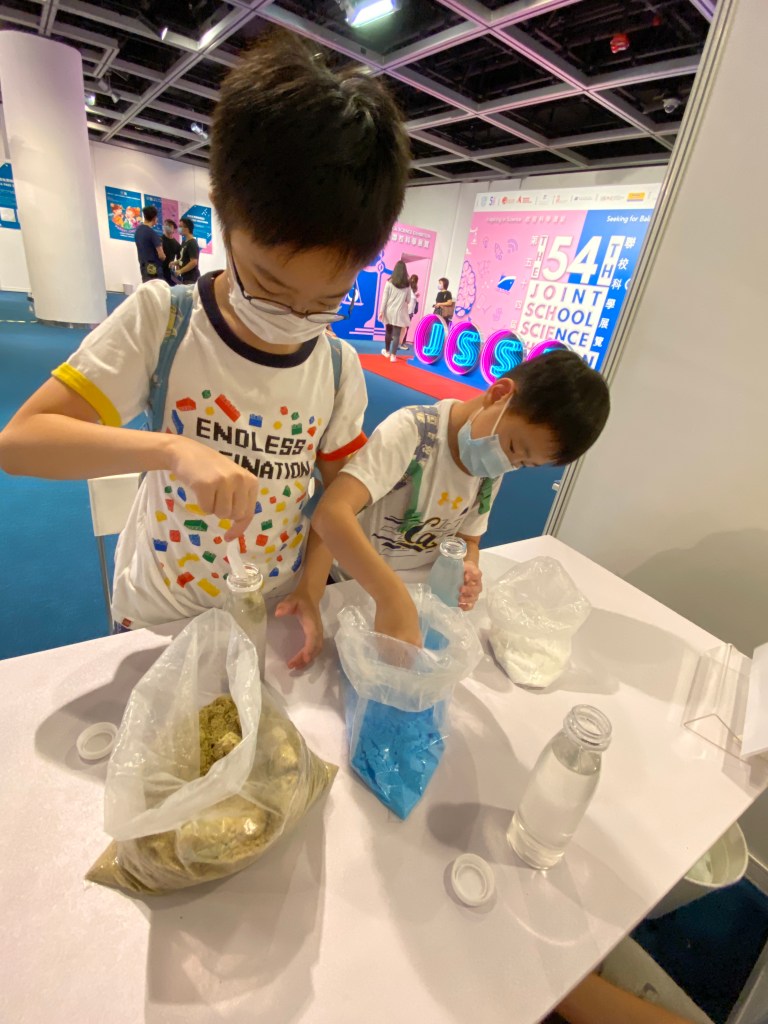 另外,我們也參與了現場的科學實驗:把三種化學粉末 (ferrous sulphate, copper (II) sulphate及potassium alum) 加入混合劑 (sodium silicate 和水),沉澱後形成美麗的園景圖案。混合劑還可以帶回家留念啊!