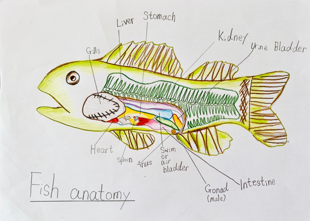我好好把握着他這刻的好奇心。離開廚房後,我請他上網學習,把魚的各個身體部份繪畫出來。過程中,他了解到,魚與跟人類結構的最大分別,在於魚是沒有肺的,而是用鰓在水中呼吸的。
