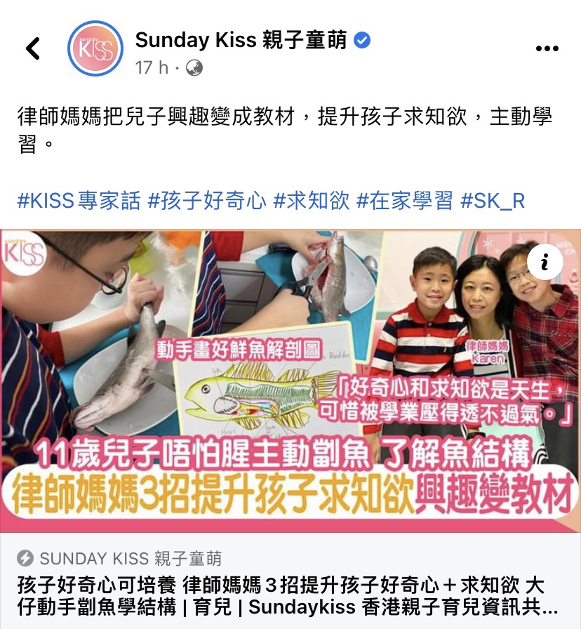 非常感謝 《Sunday Kiss 親子童萌》的報導。記者很貼心,特別向我查詢保持孩子好奇心和求知欲的方法,加入文章內。