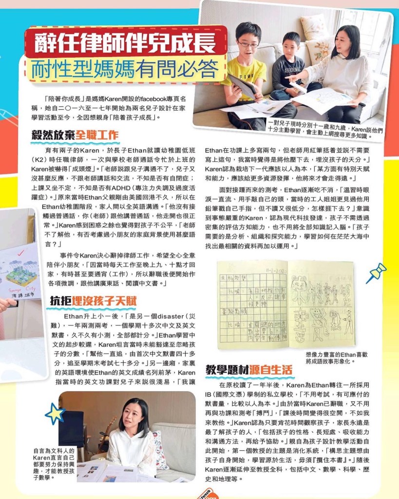 非常感謝《親子王》到訪,把我們的自學故事傳開去。由幼稚園時期的跌碰、失落,至今高小的自信、博學,一路走來,我們的目標越來越明確、清晰,成績也有目共睹。原來,越有經歷,我們越會成長。