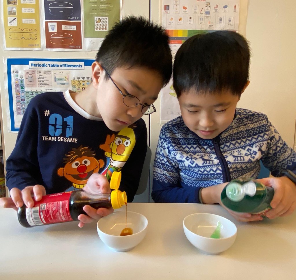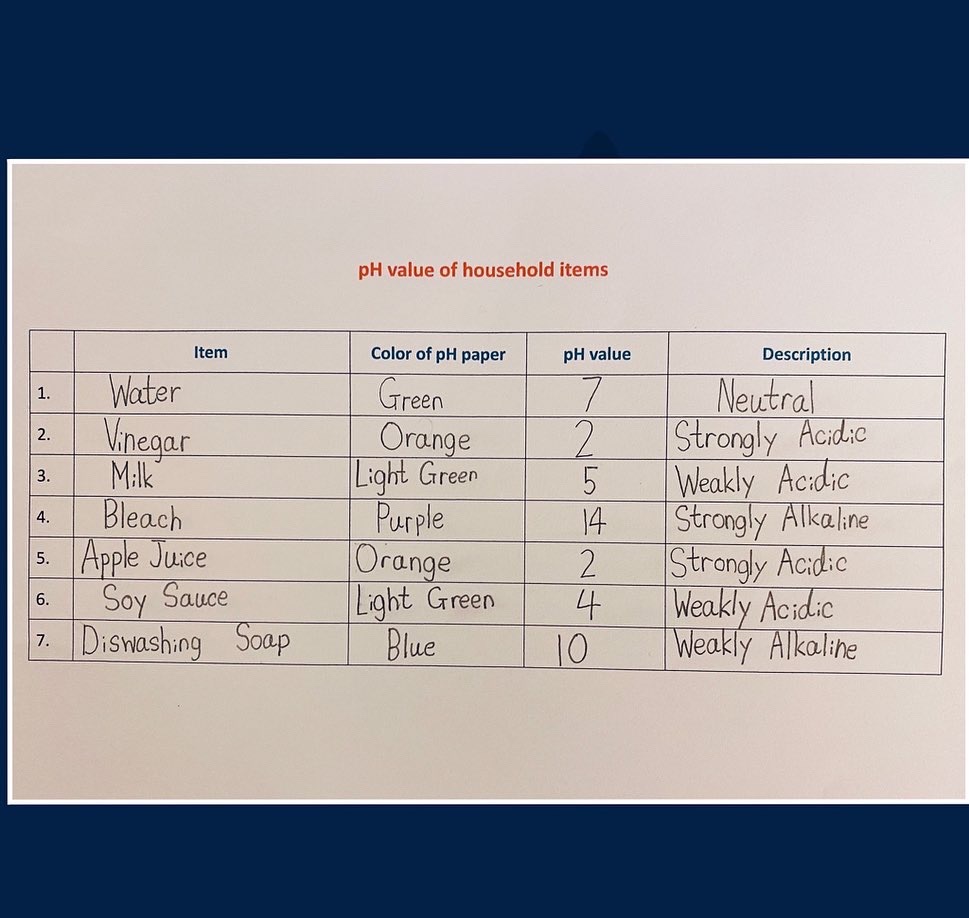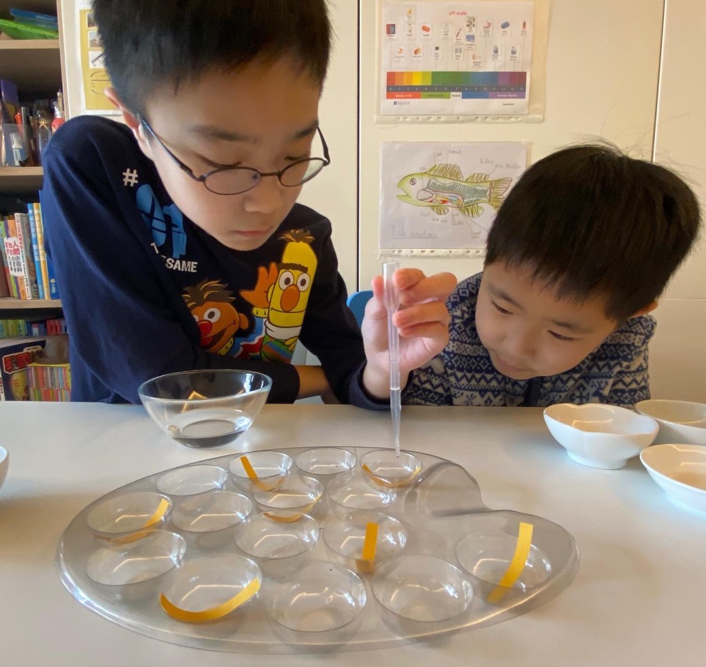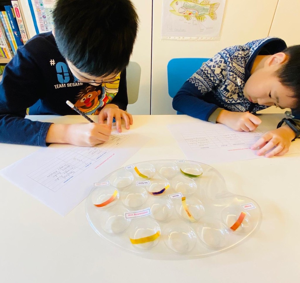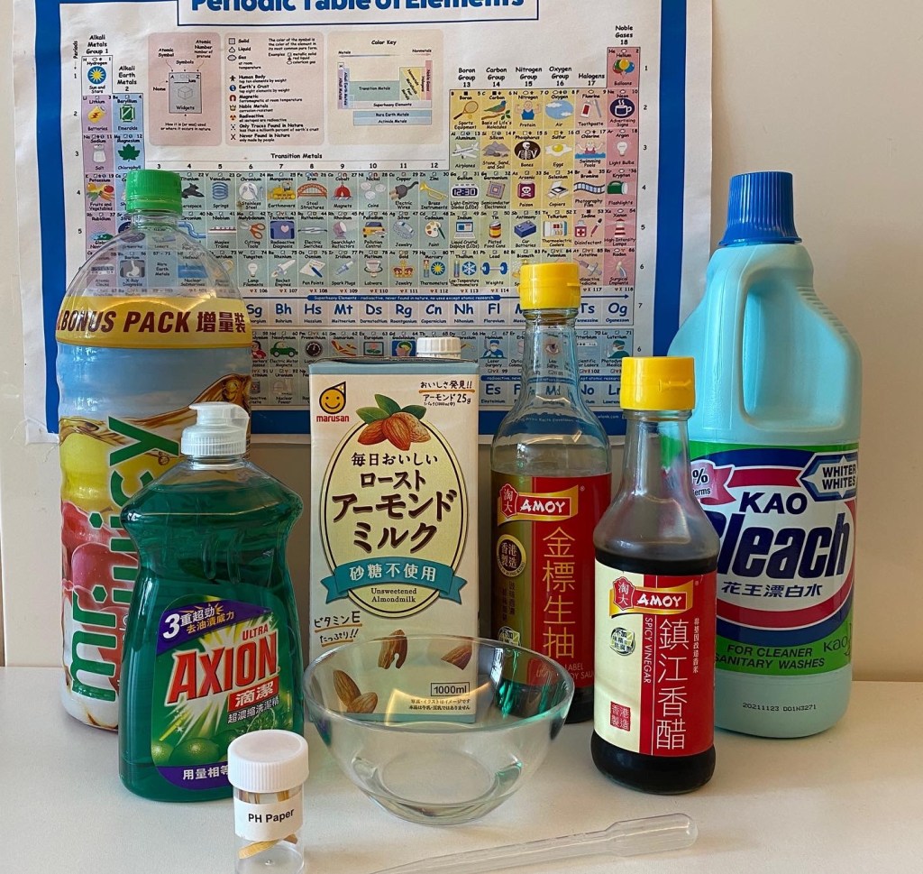 今天,我請孩子利用 pH 試紙,測試家中食物及物品的酸鹼值,然後對照顏色指標,記錄結果。