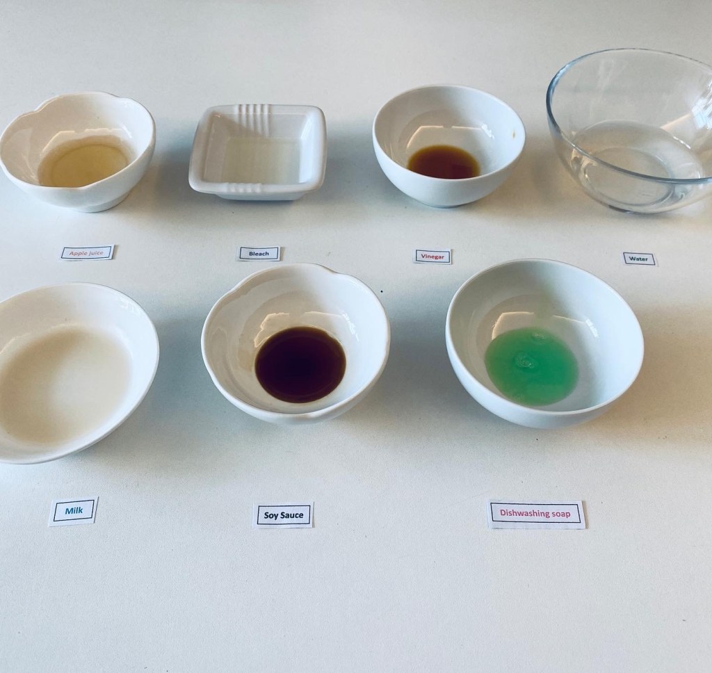 我們今次測試的液體包括:蘋果汁、醋、豉油、水、牛奶、漂白水和洗潔精。