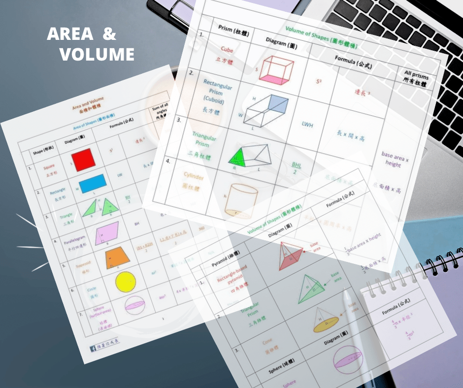 於是,我就決定自己動起筆來,自己做一份,把最常見的圖形的面積和體積公式,用中英文(因為有些公式用中文背,或英文背,會比較容易記得)清楚表列出來。