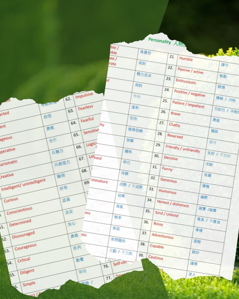 孩子的性格分析文章我會在下一帖文分享。這次,跟大家分享我們的性格詞彙表(中英對照),這是我們撰寫文章前的準備功夫,先讓孩子認識性格,理解詞彙,再下筆寫文章。