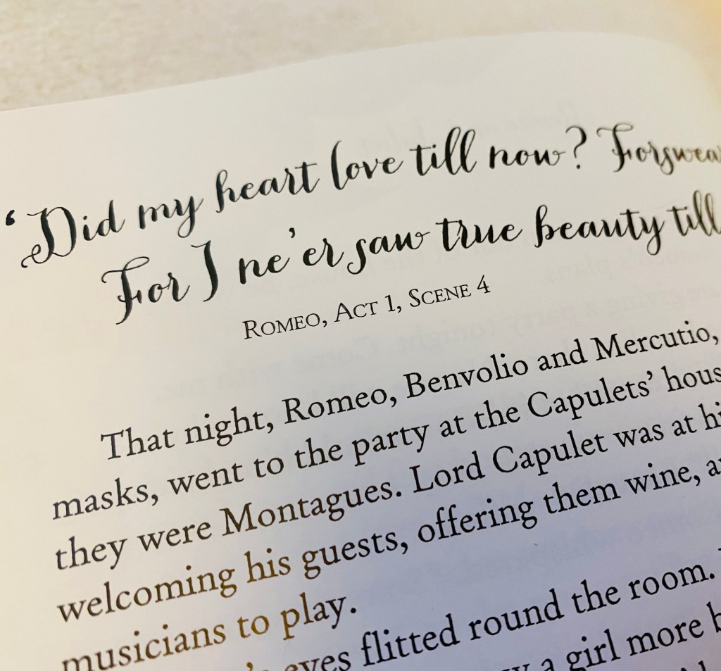 先由「威尼斯的商人」(The Merchant of Venice)的幽默開始引起興趣,然後是狂野的「仲夏夜之夢」(A Midsummer Night’s Dream)。當孩子們開始投入之際,下一篇我讓孩子們選。他們選了「安東尼與克麗奧佩托拉」(Antony and Cleopatra),選得不錯,一個以古代文明歷史為背景的愛情悲劇,我們順道重溫古埃及及古希臘的歷史。最近,是最廣為傳頌的「羅密歐與茱麗葉」(Romeo and Juliet)。