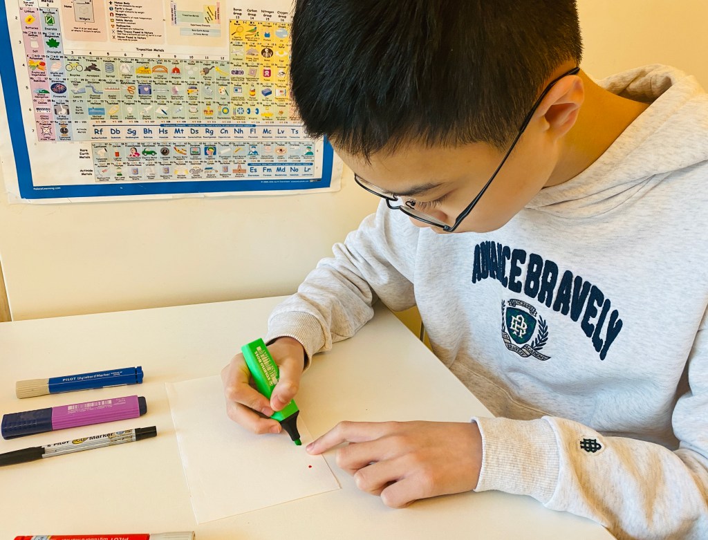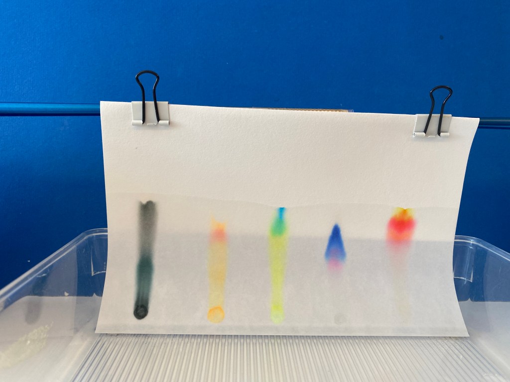 今次,我們利用濾紙,分離墨料中的顏色。由於每種成份顏色的溶解度不一樣,所以移動的速度也不一樣。觀察二十分鐘,便可在濾紙上清楚看到各種成份顏色。
