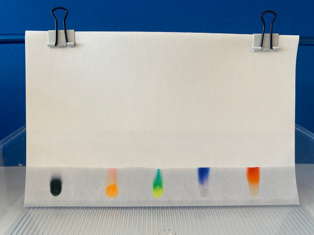 當把含有墨點的濾紙放入溶劑(水/酒精水)中時,墨水中的各種成份顏料以不同的速度浸透濾紙。其中,最易溶解的顏色將會移動得最快和最遠。