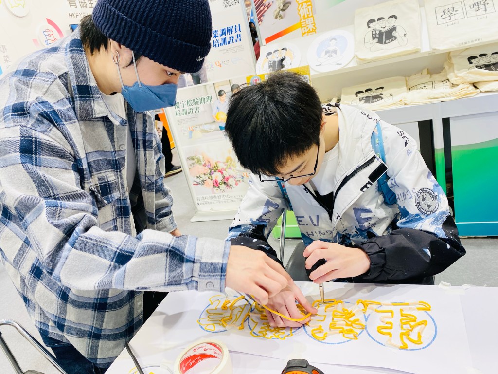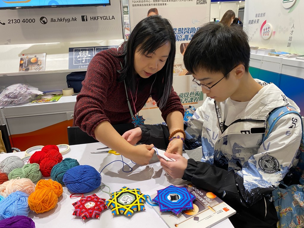 我和孩子逗留最久,是青年生活學院的攤位。這裏有很多適合青少年參與的課程介紹,現場也提供兩個別具創意的工作坊:手作霓虹燈及星之花。孩子當然馬上把握實戰機會,導師亦細心指導。臨近農曆新年,星之花就成了今年我家孩子手作的農曆新年裝飾品!
