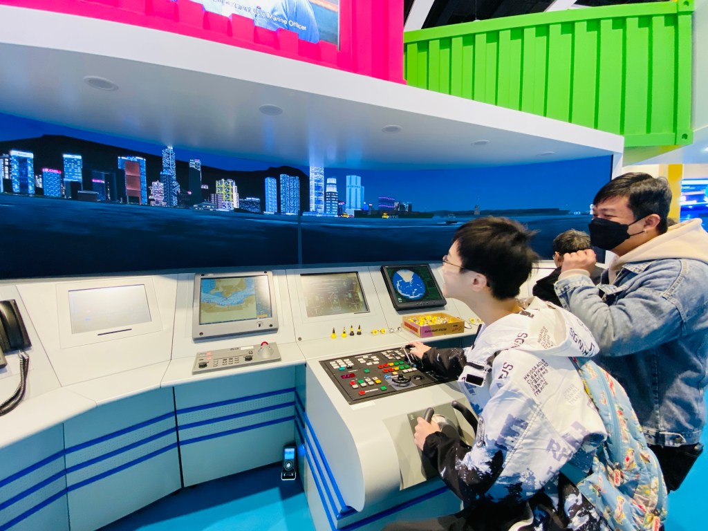 最後,我和孩子來到海事處,體驗模擬航海駕駛!在駕駛席上,有海事處的導師悉心講解,之後,孩子就在維港海域上任意航行!