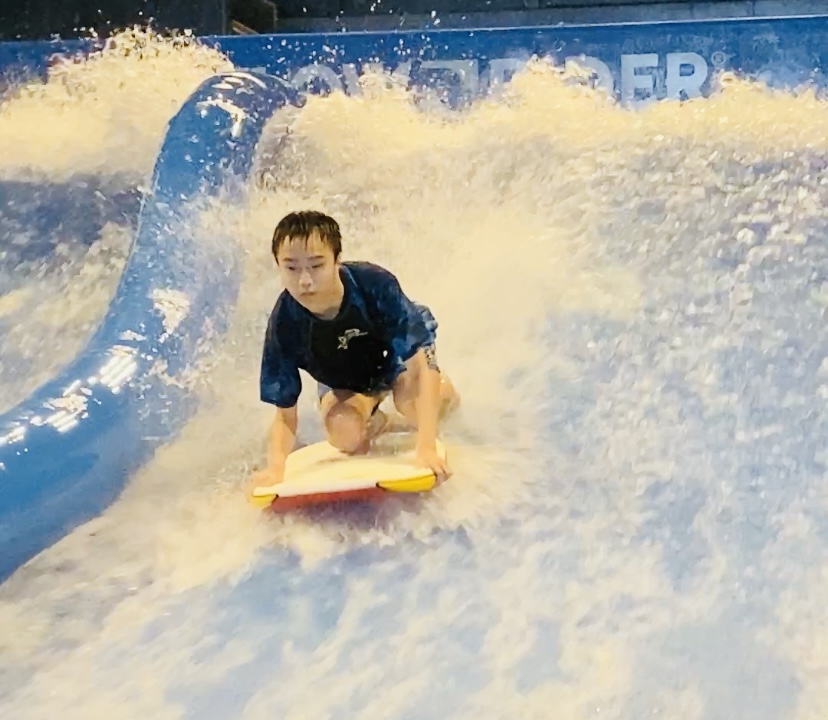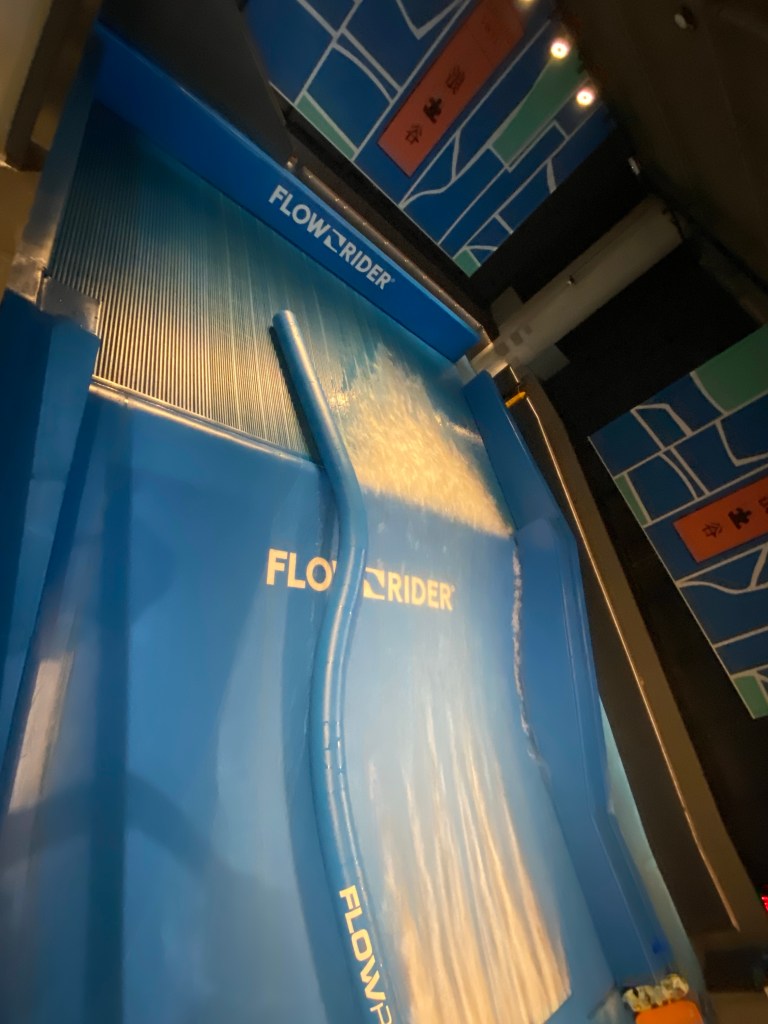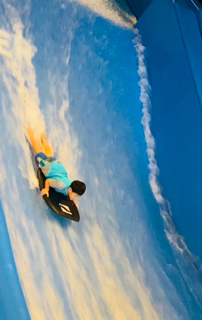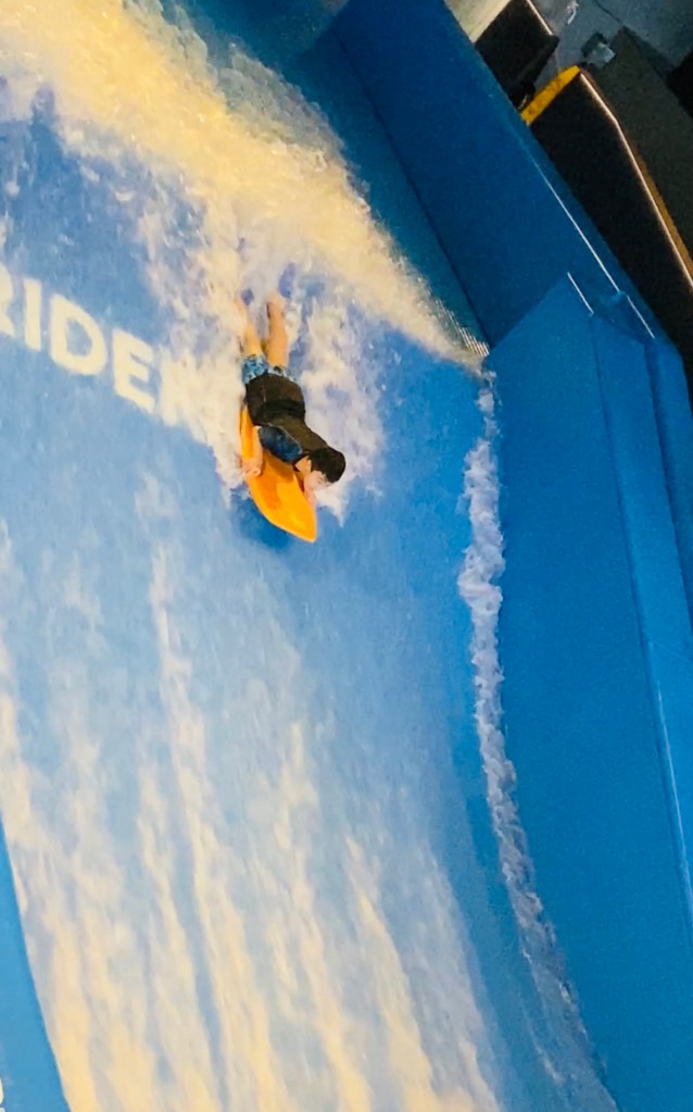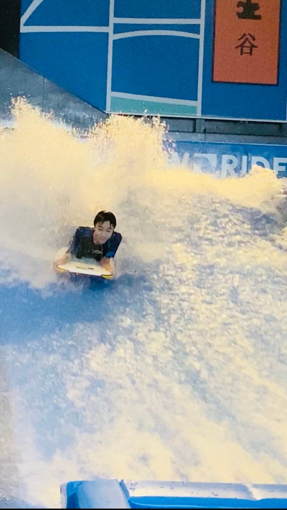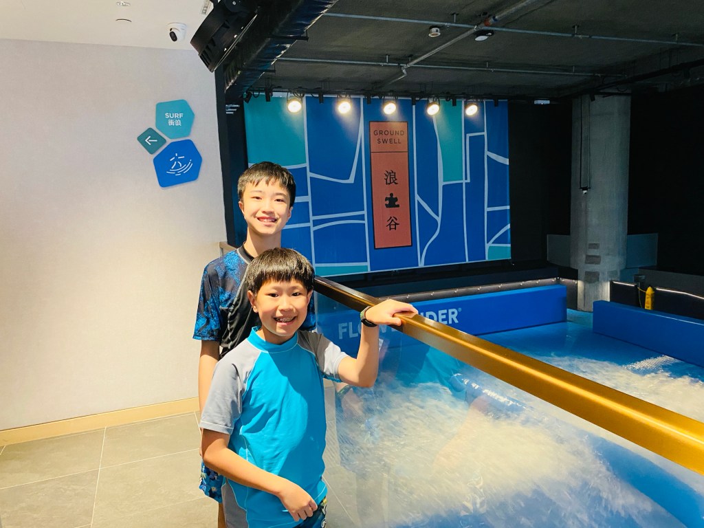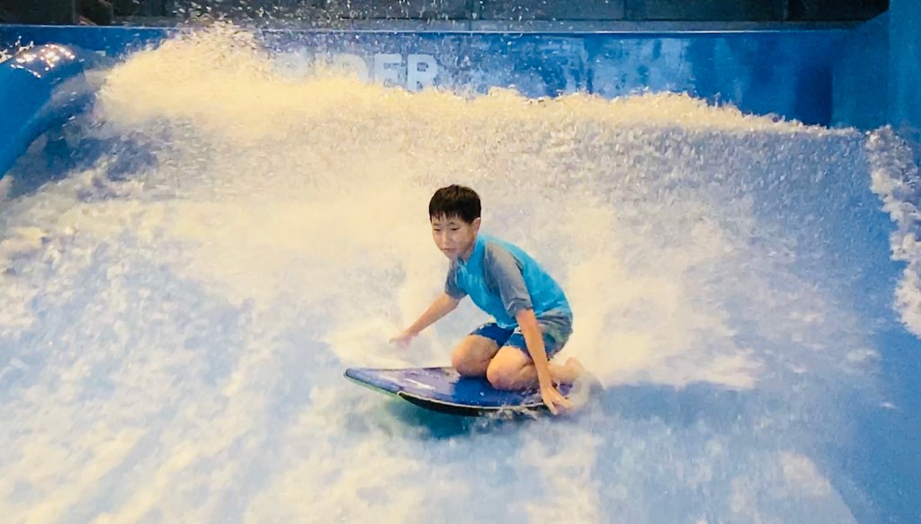 換上泳衣,孩子興奮地進入衝浪場! 這是啟德全新商場Airside 位於六樓「浪谷餐廳」內的衝浪場,於2024年1月開幕。現場所見的人造浪水流很急,水花四濺,衝得特別緊張刺激!
